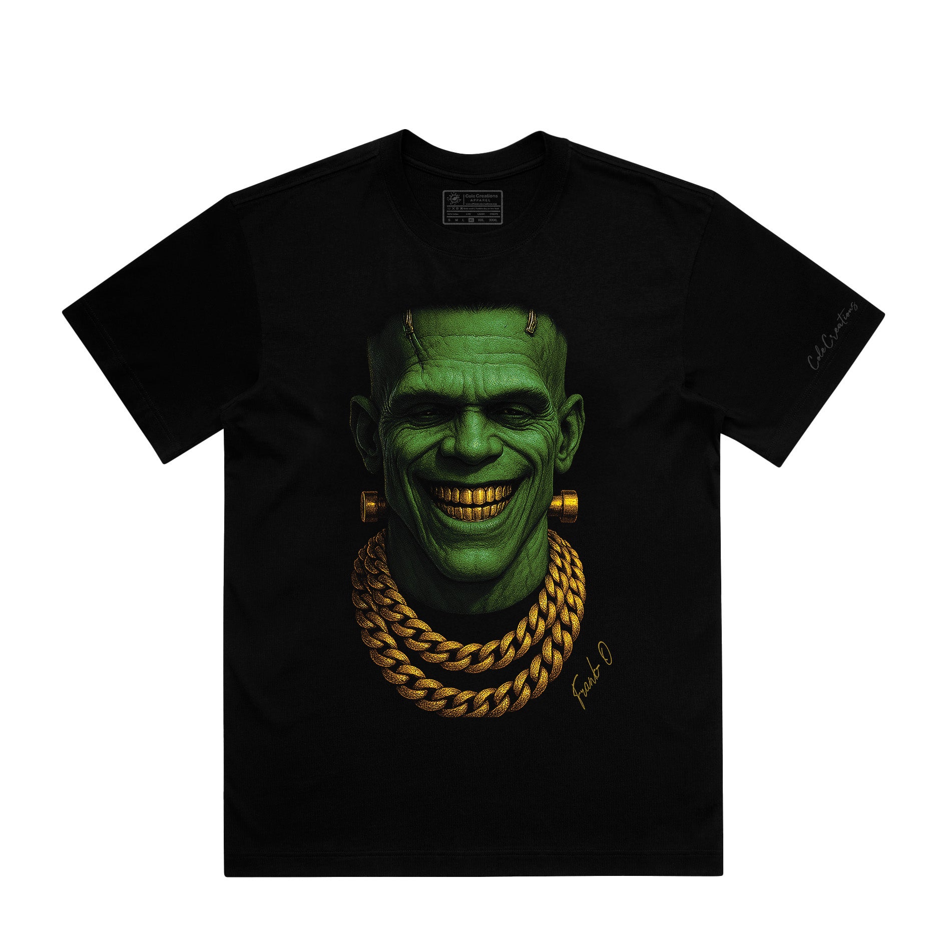 Meet Frank-O, the monster with major drip. This bold Halloween T-shirt flips the classic Frankenstein vibe with streetwear swagger — glowing green skin, a gold chain, and a wicked grin that says “It’s alive…and fresh.”